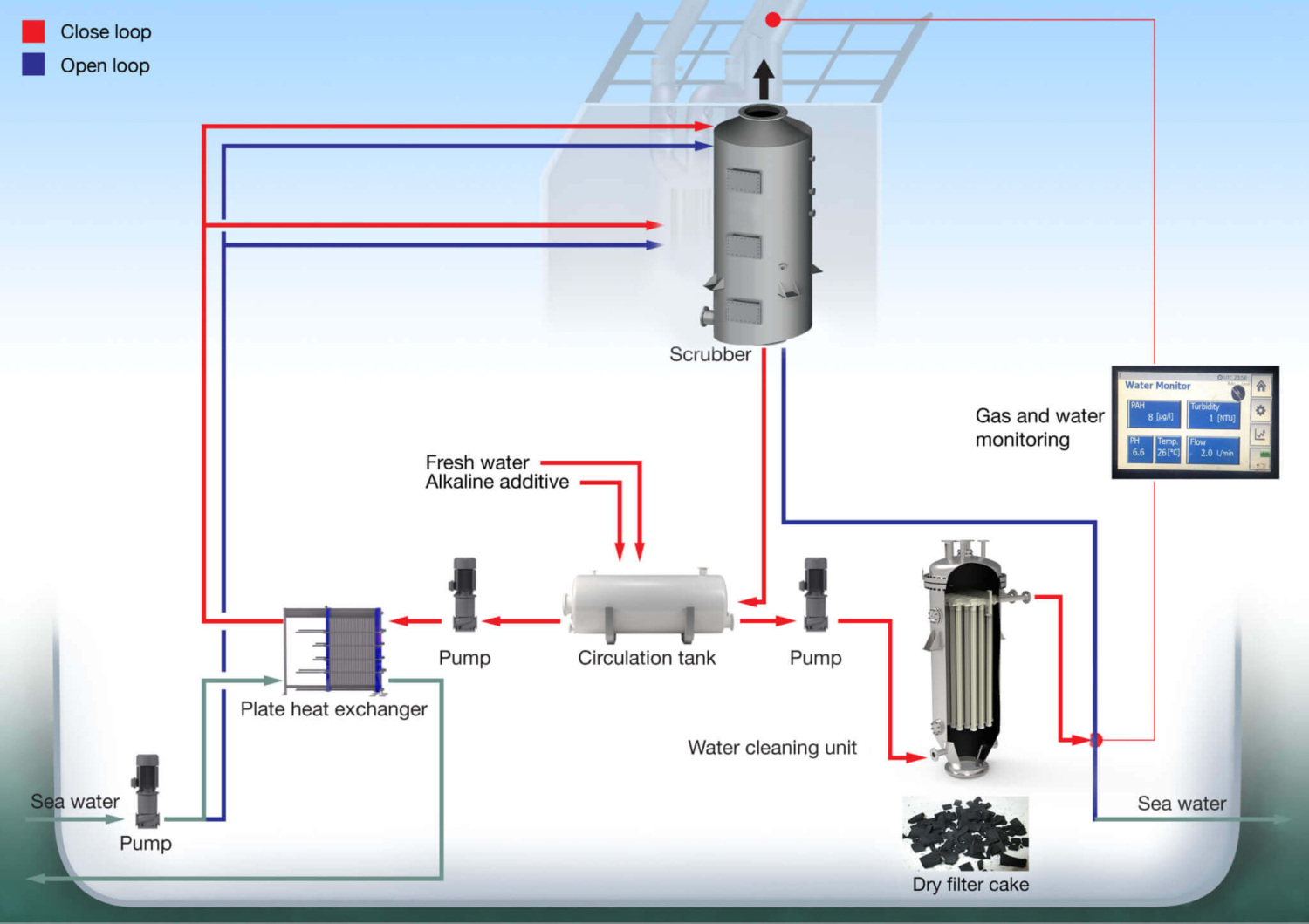 Scrubbers are configured in different ways, as open loop, closed loop or hybrid systems. Nowadays most ship owners select a hybrid system, which balances economy with operating flexibility. In a hybrid scrubber arrangement, both open-loop and closed-loop modes (blue and, respectively, red line in the schematic below) are readily available. Open-loop operation reduces costs whenever possible, but a switch to closed-loop operation can be made whenever local water discharge regulations demand it.