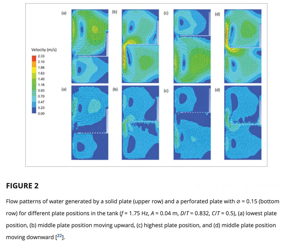The review highlights that vibromixers rely on oscillatory motion rather than rotational impellers to generate fluid flow and solids suspension. Instead of a rotating shaft, a perforated plate oscillates at high frequency and low amplitude, generating alternating pressure zones that produce strong, controlled axial recirculation. This fundamental difference leads to distinct flow regimes and energy distribution characteristics compared to conventional stirred tanks.