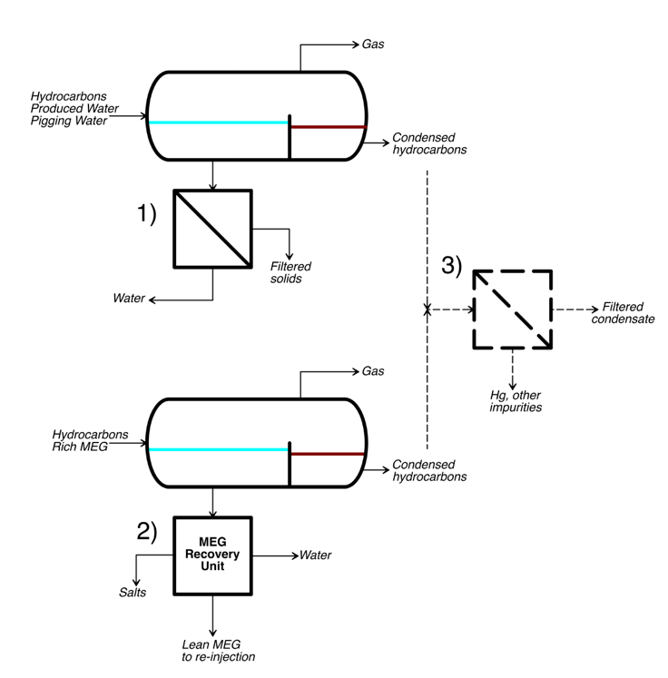 Hydrocarbon condensate which carry over solids from the slug catcher may also require further treatment.