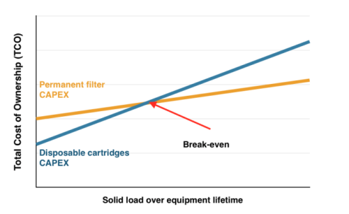 As expected, the lifetime cost of a cartridge filter system is lower than that of a FUNDABAC® Filter in low solid loading applications (say, below 5’000 kgs/year) since the number of replacement cartridges is fairly proportional to the solid load.