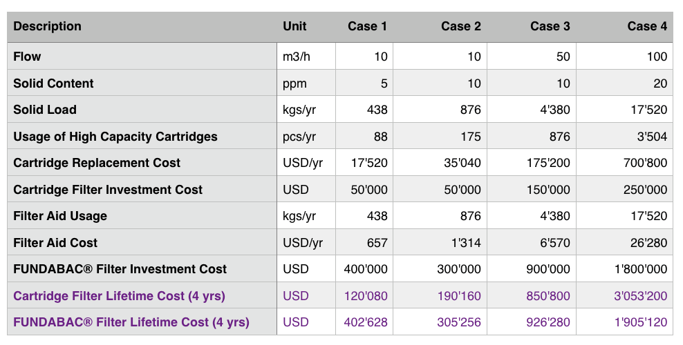Please note that above figures do not take into consideration the disposal cost of either the solids cake discharged from a FUNDABAC® Filter or alternatively filter cartridges.