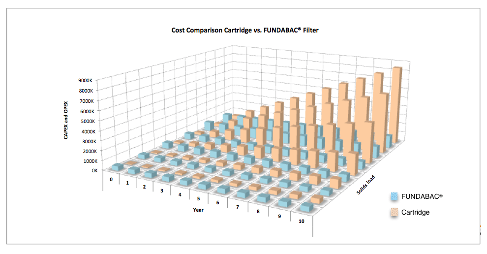For higher flow and solids concentrations, the FUNDABAC® filter is more cost economical than cartridge filter systems. It should be noted that this analysis only takes CAPEX and OPEX into account. Other factors such as operator and environmental safety, proximity of disposal sites as well as physical space requirements may impact investment decisions.